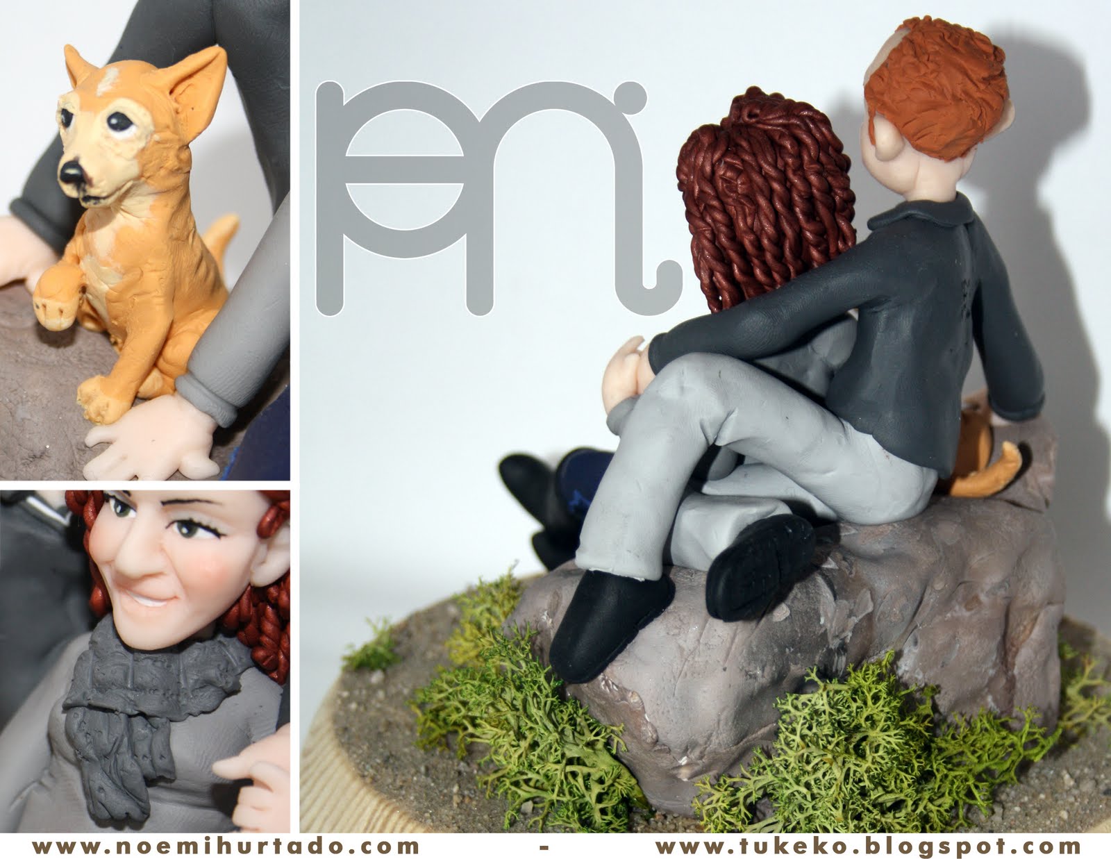 Como todas mis creaciones están modelados completamente a mano en arcilla polimérica y puestos sobre una peana de madera natural con los nombres y la fecha de la boda grabados en una plaquita también de arcilla.